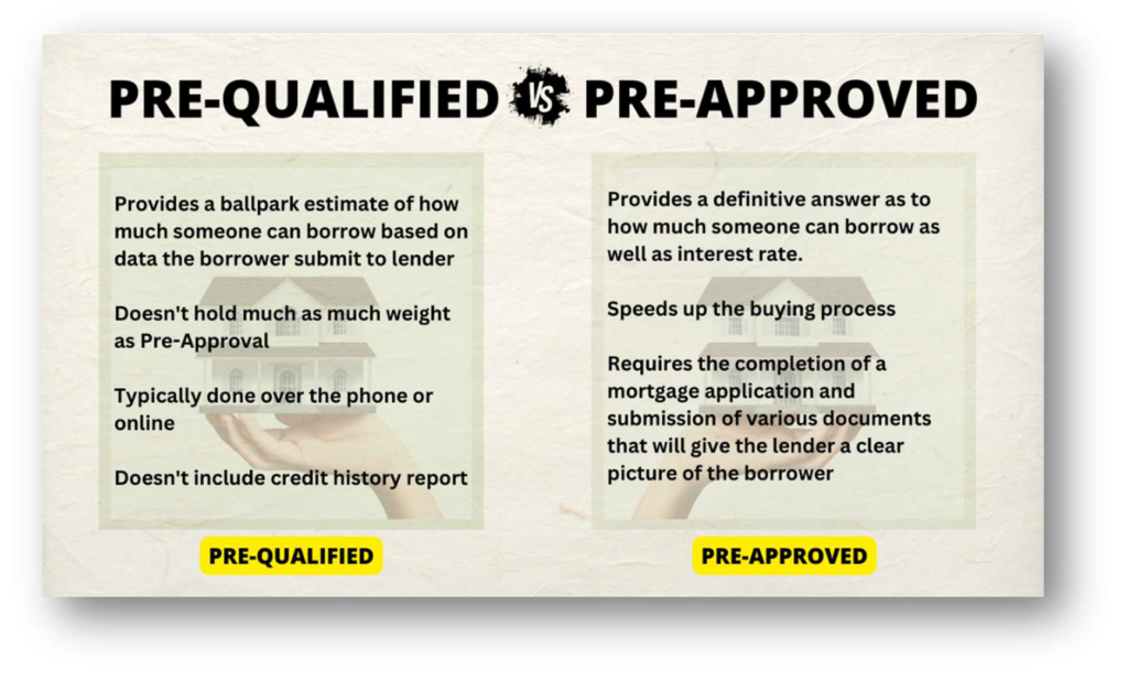 capacity, does not involve a credit check or detailed documentation review. - Pre-Approval: Requires submission of financial documents, involves a credit check, provides a